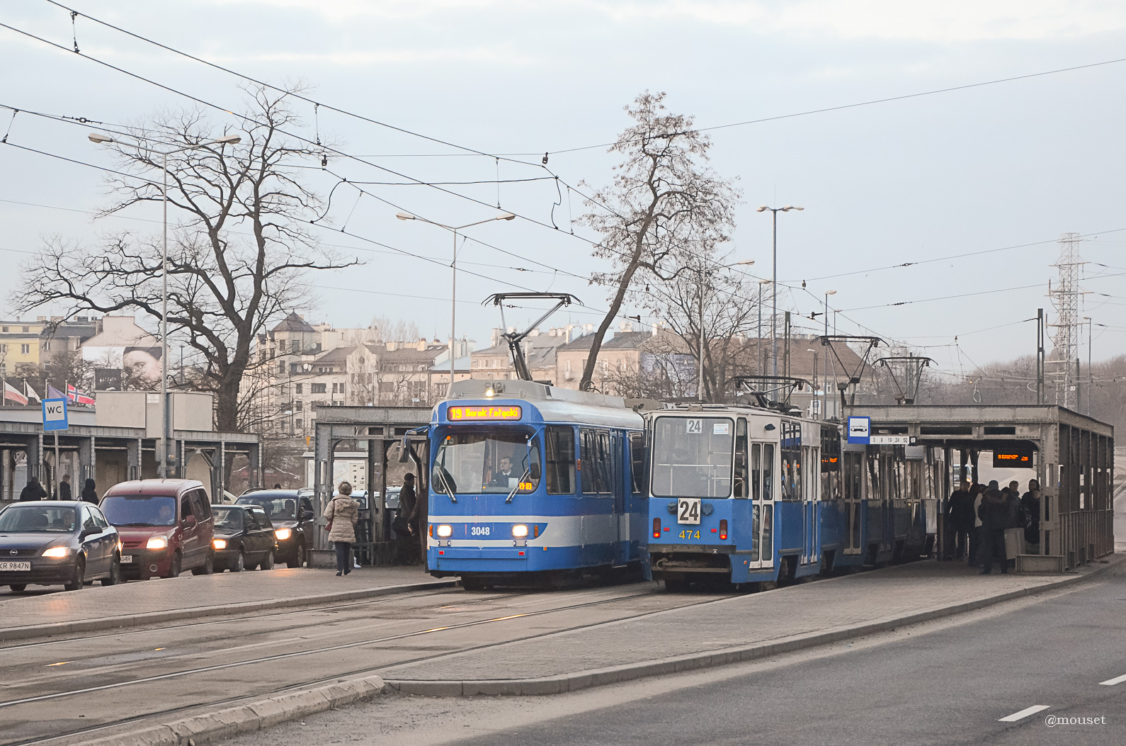 Słowa kluczowe: MPK Kraków, Duewag, GT8S, 3048, linia 19, Konstal, 105Na, 472+473+474, linia 24, plac Bohaterów Getta, Kraków, małopolskie