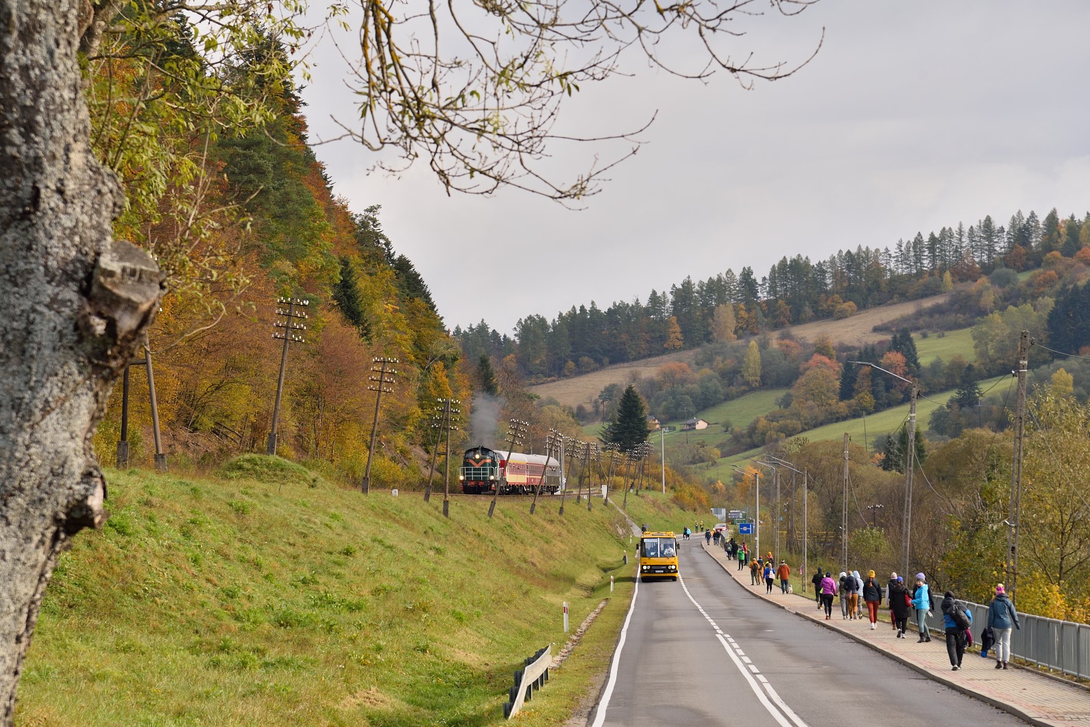 "Jesień bieszczadzka w pełnej krasie, pociągowi Turkolu, który minął p.o. Komańcza Letnisko, towarzyszą Ikarus 280.03 oraz uczestnicy biegu Łemko Trail."